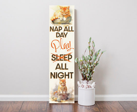 Charming Wooden Cat Porch Sign - Nap All Day Play All Night Door Decor 36 Inch