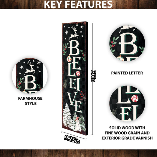 36in Believe Christmas Porch Sign | Rustic Farmhouse Snowman Holiday Decor