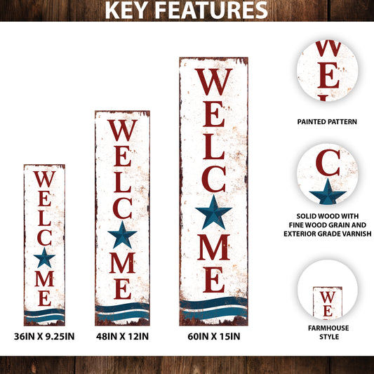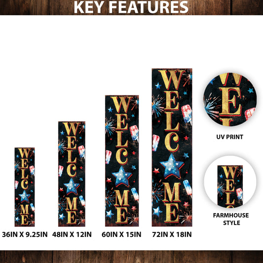 4th of July Welcome Porch Sign | Patriotic Vertical Sign for Door, Mantel & Entryway | UV Printed Wood | Rustic Farmhouse Style | Multi Sizes