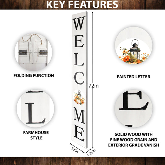72in "Welcome" Fall Porch Sign with Lantern Design - White Porch Board Decor for Front Door during Autumn and Thanksgiving Celebrations