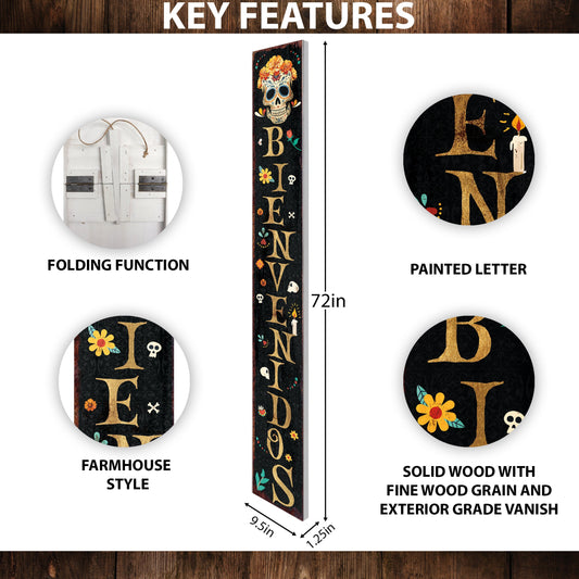 72in 'Bienvenido's' Porch Sign for Front Door - Vintage Dia De Los Muertos Decor, Rustic Modern Farmhouse Entryway Decor