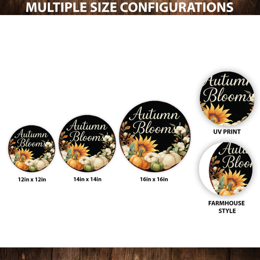 Autumn Blooms Fall Door Hanger – Round Wood Sign with Pumpkins & Sunflowers, UV Print for Front Door or Wall, 12–16in