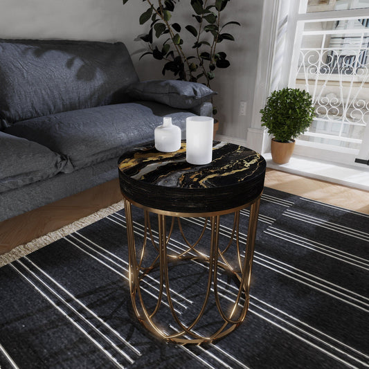 Black & Gold Marble Pattern Accent Table | 14_ Diameter| 17_ High| Round End Table| UV Print Outdoor Side Table, Wood and Metal Construction