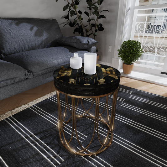 Black & Gold Geometric Accent Table | 14_ Round End Table for Indoor , UV Print Side Table, Wood and Metal Construction