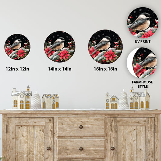 Chickadee Christmas Wall Sign – Round Wood Winter Decor with Poinsettias