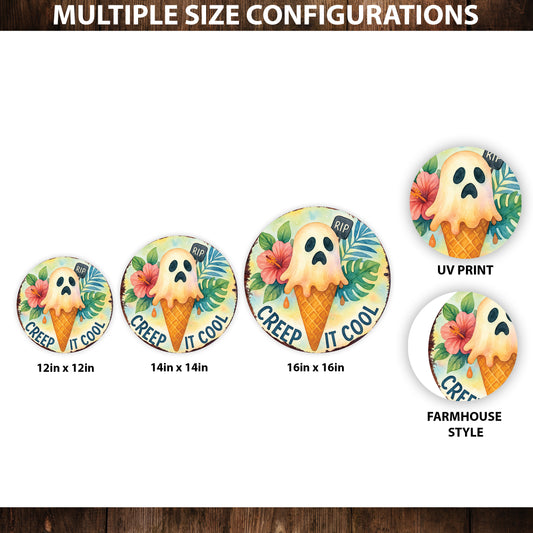 Creep It Cool Halloween Door Hanger – Summerween Ghost Ice Cream Décor – Round UV Print Sign