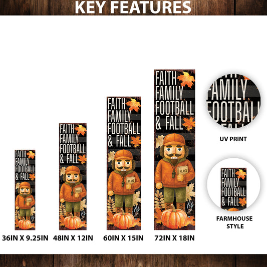Faith Family Football Fall Porch Sign – 36–72in UV Printed Nutcracker Coach, Autumn Outdoor Entryway or Patio Seasonal Decor