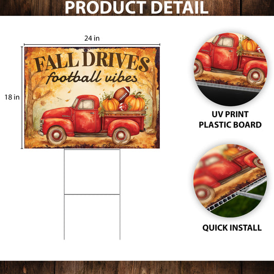 Fall Drives Football Vibes Yard Sign – 18x24 Fall Red Truck Garden Stake, UV Printed Plastic Board with Metal Step-Stake