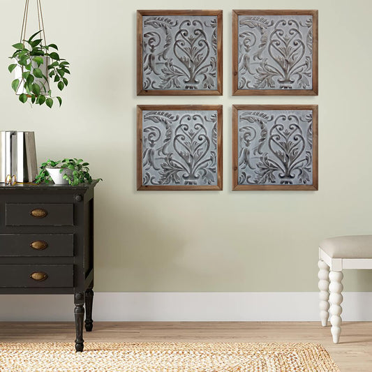 Elegant Framed Wood Plaques Set of 4 | Pressed Tin Wall Art in Warm Brown Tone | Home & Office Decor