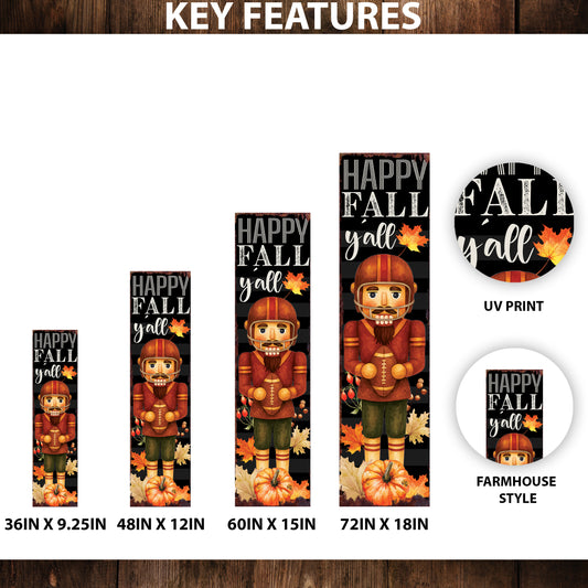 Happy Fall Y’all Football Porch Sign – UV Printed Autumn Decor with Nutcracker Player, 36–72in Vertical Entryway or Patio Board