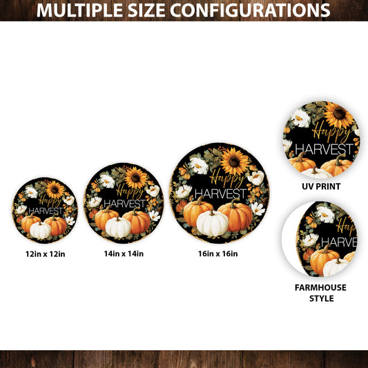 Happy Harvest Door Hanger – Round Wood Sign with Pumpkins & Sunflowers, UV Print for Front Door or Wall Decor, 12–16in