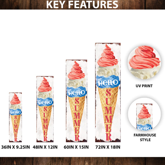 Hello Summer Porch Sign | Ice Cream Cone Door Decor | 4th of July Outdoor Sign | Farmhouse Summer Front Porch Decor | UV Printed Wood
