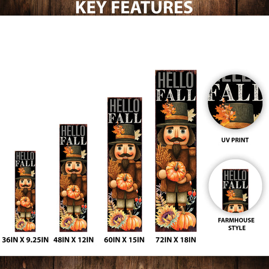 Hello Fall Porch Sign – UV Printed Nutcracker Autumn Decor, 36–72in Vertical Farmhouse Board for Porch, Patio, or Entryway Display