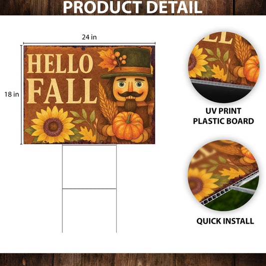 Hello Fall Yard Sign with Sunflower & Nutcracker – UV Print 24x18in Corrugated Plastic Lawn Stake for Autumn Outdoor Display