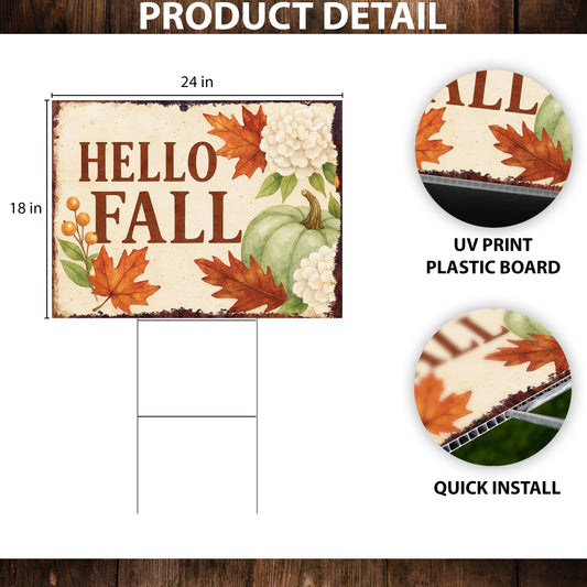 Hello Fall Yard Sign with Green Pumpkin & Flowers – 24x18in Outdoor Lawn Stake, UV Printed Corrugated Plastic Autumn Decor