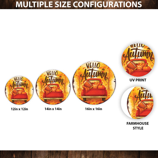 Hello Autumn Door Hanger – Round Wood Sign with Red Truck & Pumpkins, UV Print Fall Decor for Front Door or Wall, 12–16in