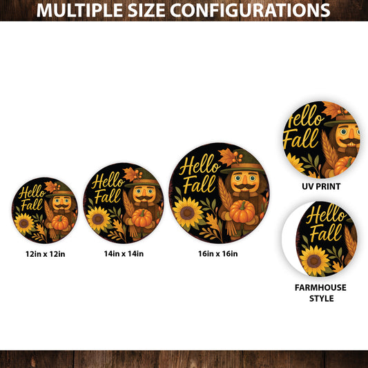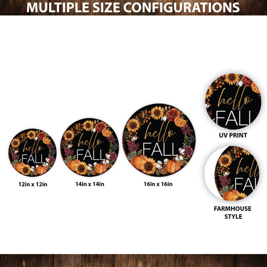 Hello Fall Door Hanger – Round 12–16in Wood Sign, UV Print Autumn Floral Pumpkin Wreath Decor for Front Door or Wall