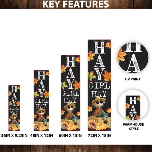 Hay Girl Hay Fall Porch Sign – Funny Autumn Front Porch Decor with Scarecrow & Leaves – Vertical UV Printed Outdoor Sign