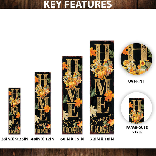 Home Sweet Home Fall Porch Sign – Vertical Wood Decor with Floral Heart, UV Printed, Farmhouse Style, 36–72in Sizes