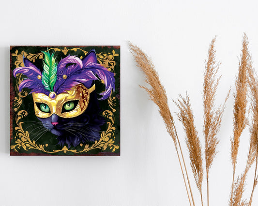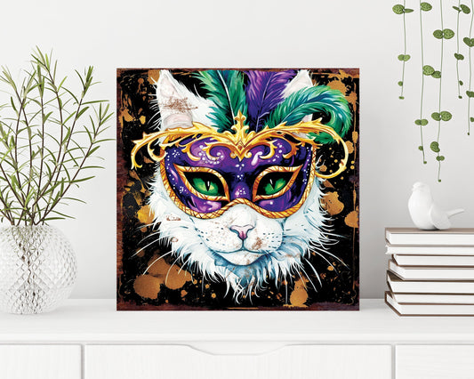 Mardi Gras Cat Wall Art | Vintage Farmhouse Square Decor | Festive Accent