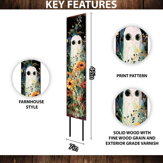42in Wildflower Ghost Halloween Garden Stake - Whimsical Outdoor Wood Decor