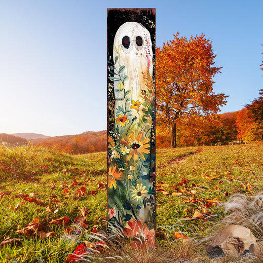 Whimsical Halloween Ghost Garden Stake - 42" Watercolor Wildflower Yard Art