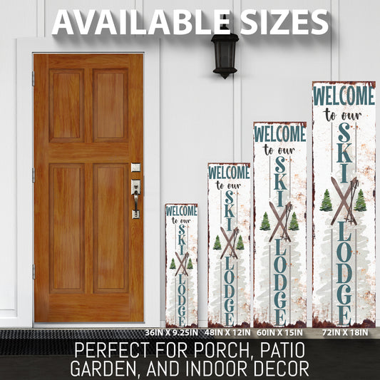 Welcome to Our Ski Lodge Porch Sign | Rustic Winter Cabin Decor with Skis & Pines | Farmhouse Entryway Sign for Porch Indoor