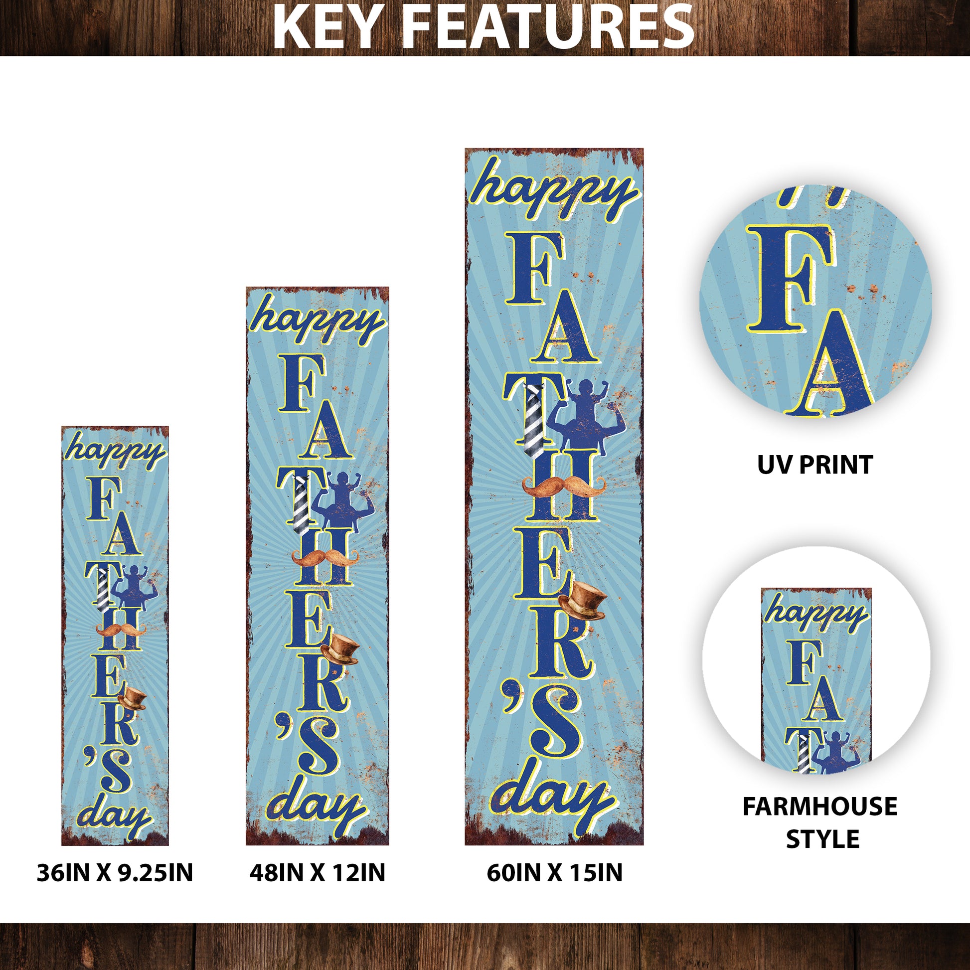 Celebrate dad in style with this Happy Father’s Day Porch Sign, designed to bring festive charm to your front porch, entryway, or garden. Featuring a playful blue backdrop, retro typography, and icons like a mustache, tie, and top hat, this vertical sign is perfect for honoring fathers. Available in multiple sizes and printed with UV-resistant ink, it’s ideal for outdoor use and adds a warm, welcoming touch to any Father’s Day celebration.