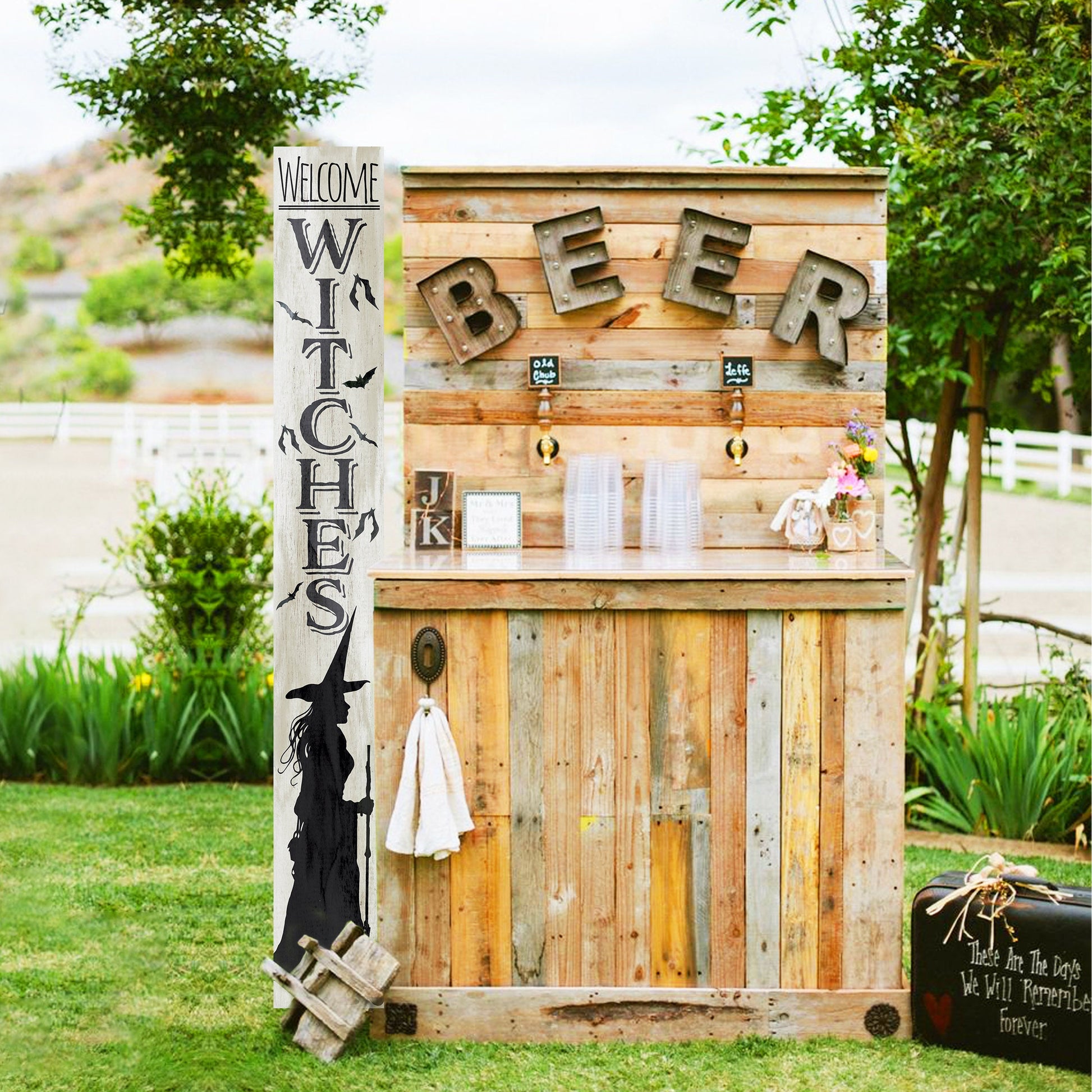 Designed to withstand the elements, our "Welcome Witches" sign maintains its allure throughout the spooky season, providing a bewitching touch to your outdoor decor. As you prepare for Halloween festivities, this captivating accessory serves as the perfect backdrop for your celebrations.