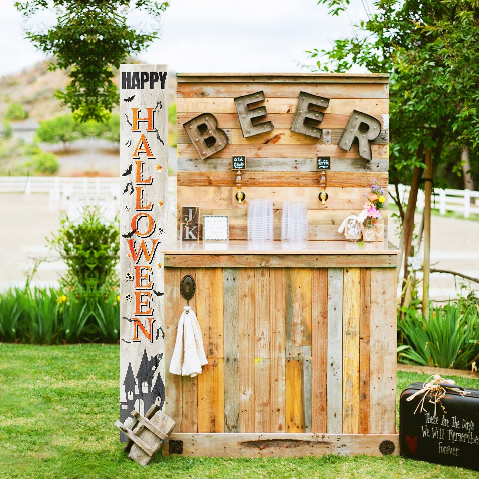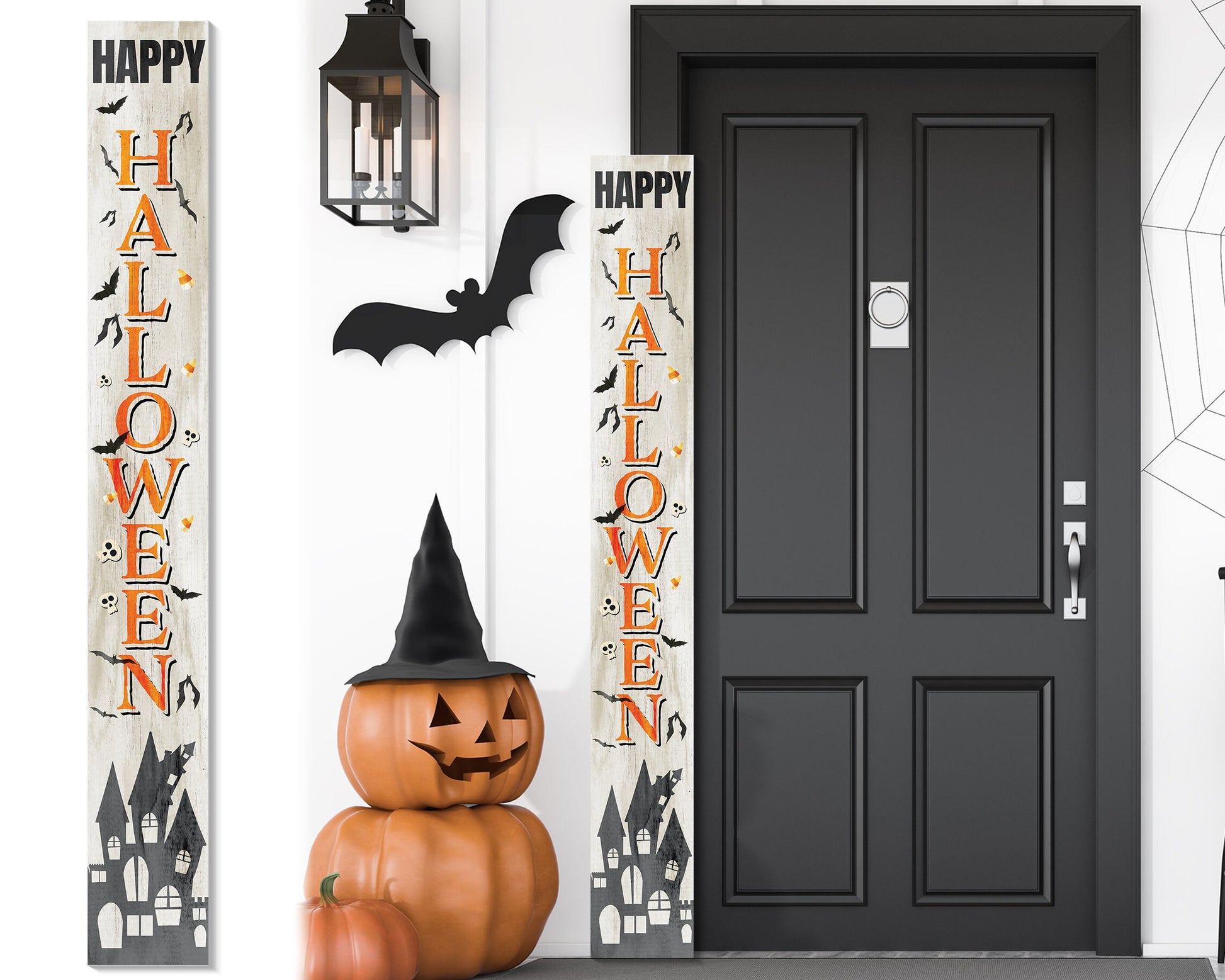 Add a touch of spooky charm to your front door with this 72-inch tall wooden "Happy Halloween" porch sign. Perfect for creating a haunting atmosphere at your home's entrance, this wooden sign features a festive design that captures the essence of the Halloween season.