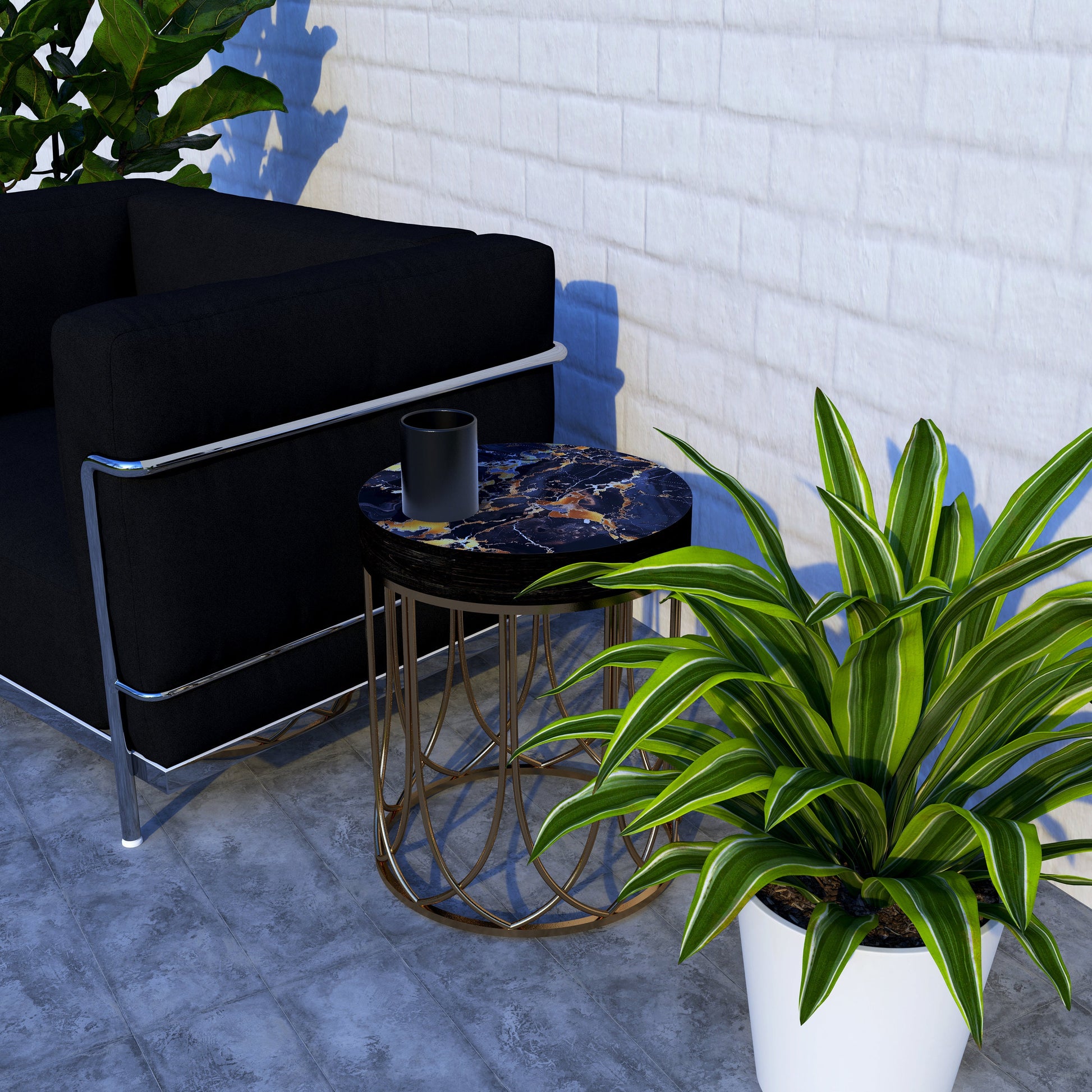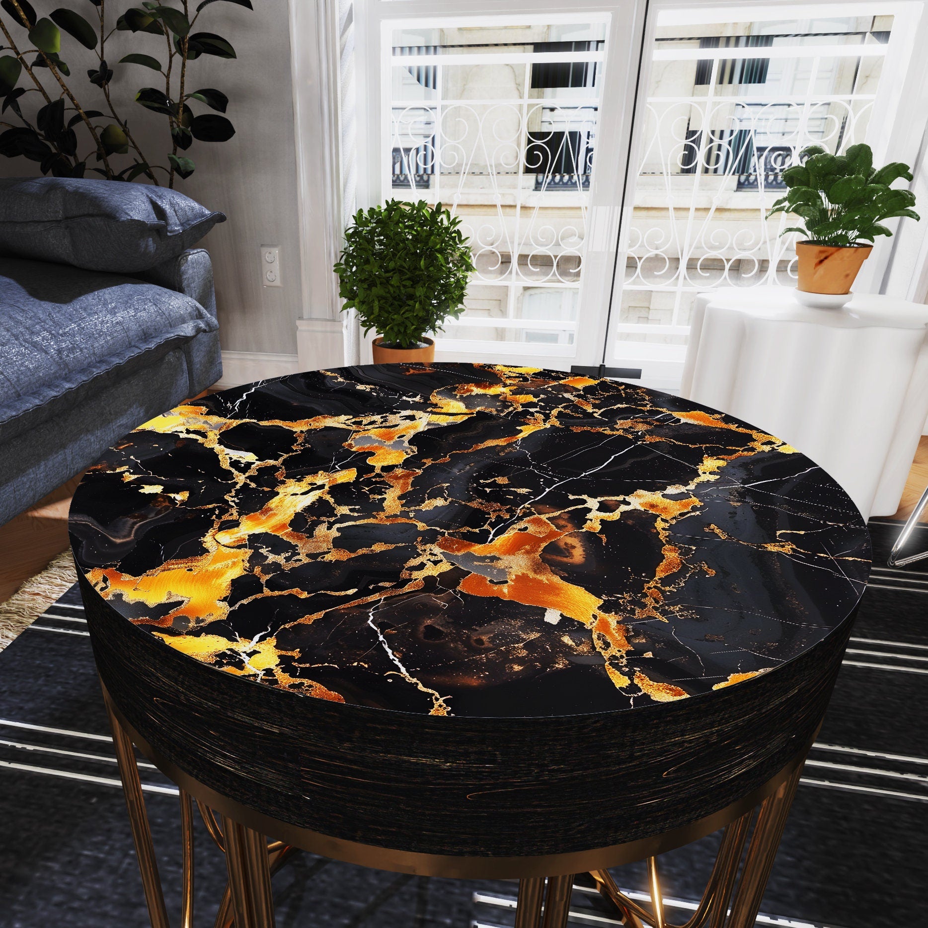 Black & Gold Marble Pattern Accent Table | 14_ Diameter| 17_ High| Round End Table| UV Print Outdoor Side Table, Wood and Metal Construction