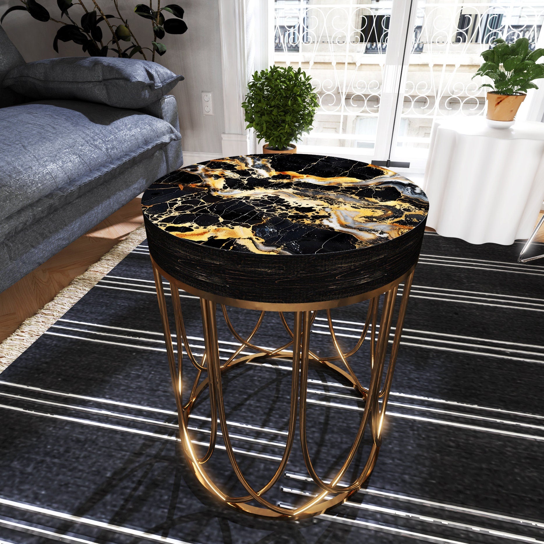 Black & Gold Marble Pattern Accent Table | 14in Diameter | 17in High | Round End Table | UV Print Side Table | Wood and Metal Construction
