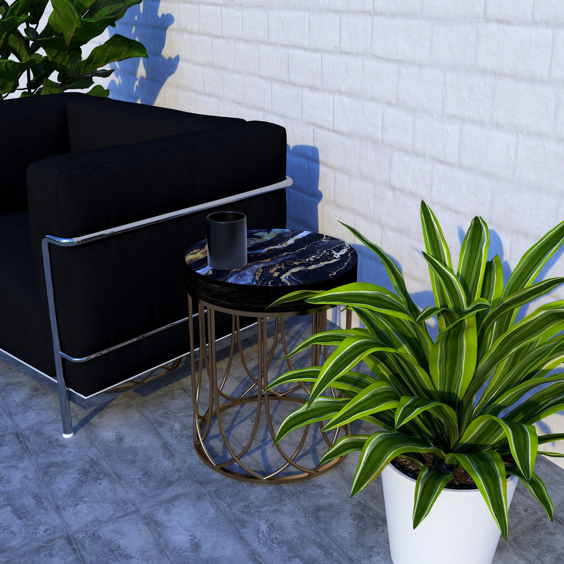 Introducing the stunning farmhouse-style black and gold marble pattern accent table, a perfect blend of elegance and functionality. Measuring 14 inches in diameter and 17 inches high, this round end table is designed to enhance both your indoor and spaces. Crafted with a durable wood and metal construction, this table ensures long-lasting use and stability.