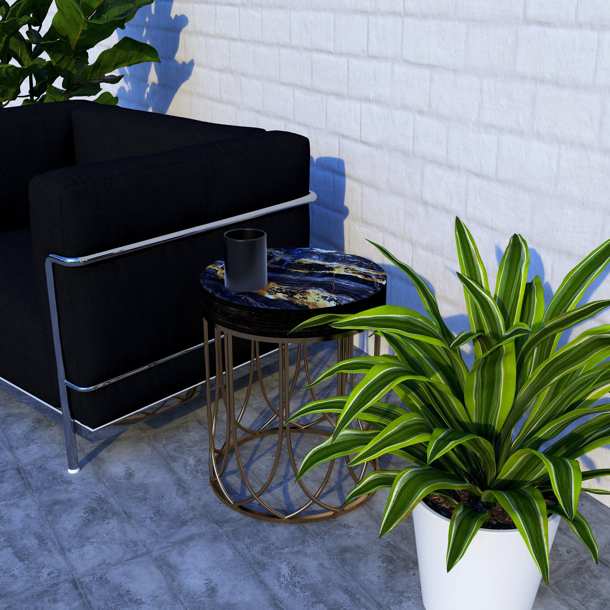 Introducing the stunning farmhouse-style black and gold marble pattern accent table, a perfect blend of elegance and functionality. Measuring 14 inches in diameter and 17 inches high, this round end table is designed to enhance both your indoor and spaces. Crafted with a durable wood and metal construction, this table ensures long-lasting use and stability.