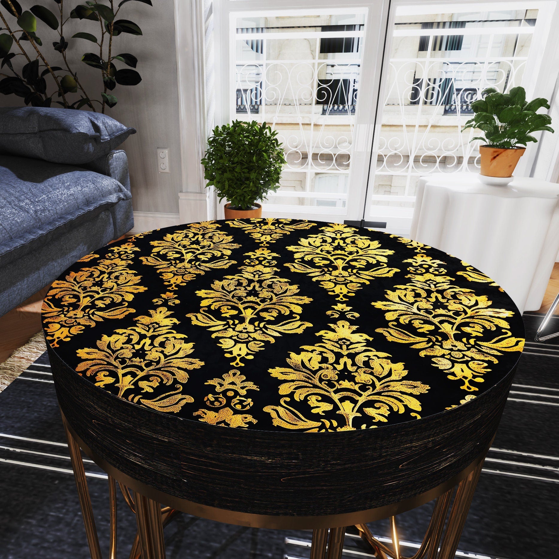 The tabletop features a sophisticated black and gold Victorian pattern created with advanced UV print technology, ensuring a vibrant and fade-resistant design. This intricate pattern adds a touch of elegance and luxury to any space, making it a versatile piece that complements various decor styles.