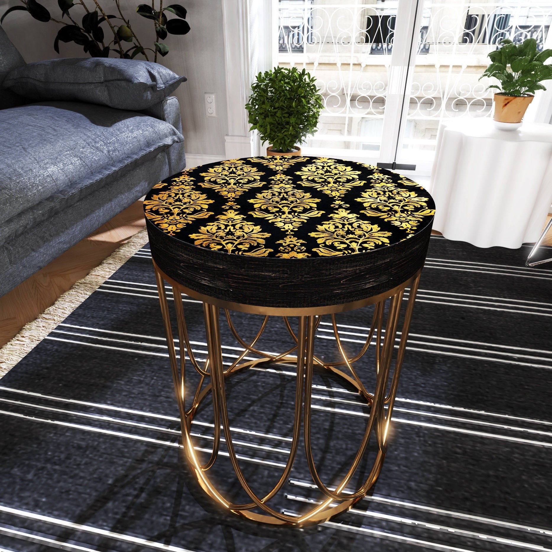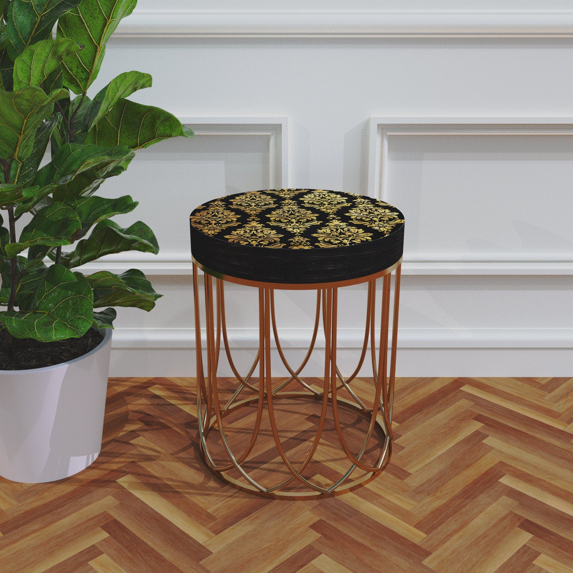 Black & Gold Victorian Pattern Accent Table, 14_ Diameter, 17_ High, Round End Table, UV Print Wood and Metal Construction