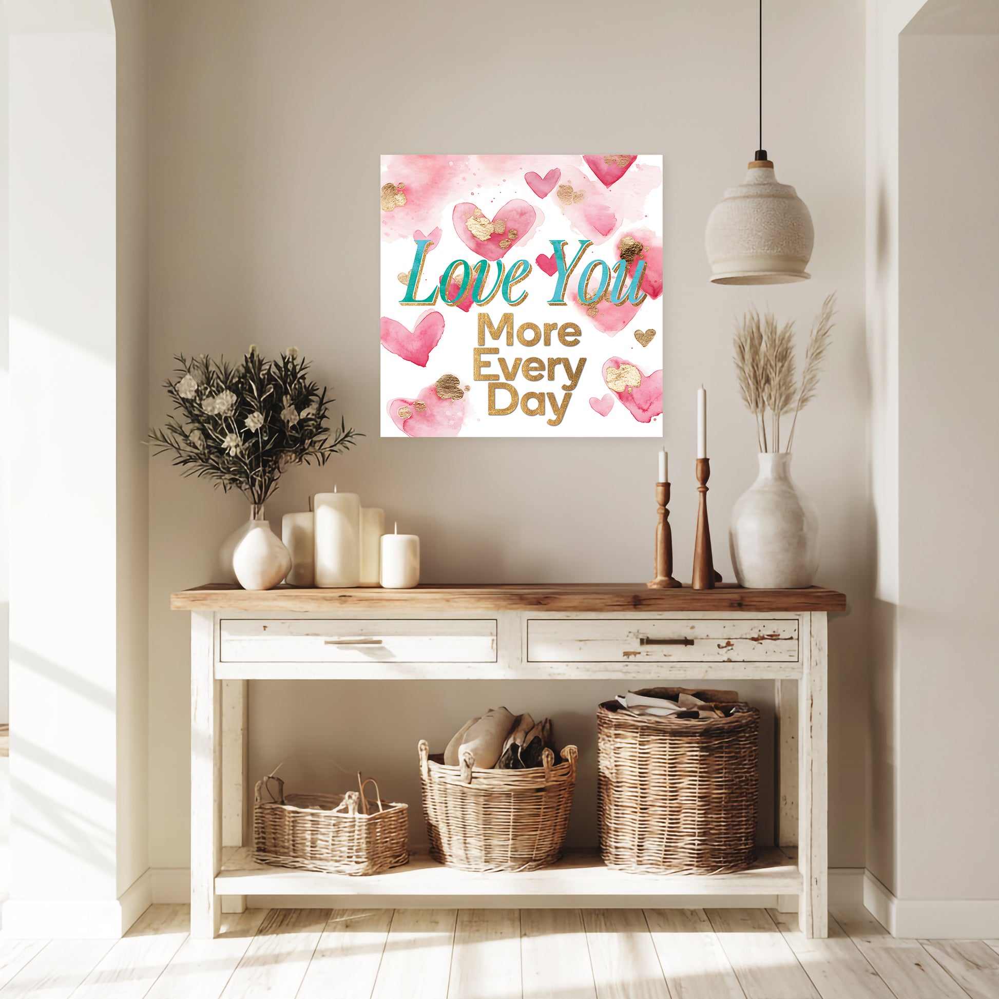 This beautifully designed canvas art, featuring the heartfelt message "Love You More Every Day," perfectly captures the essence of deep affection. Its modern farmhouse style and soft hues create a welcoming ambiance, making it a thoughtful gift or a cherished addition to your own home decor.