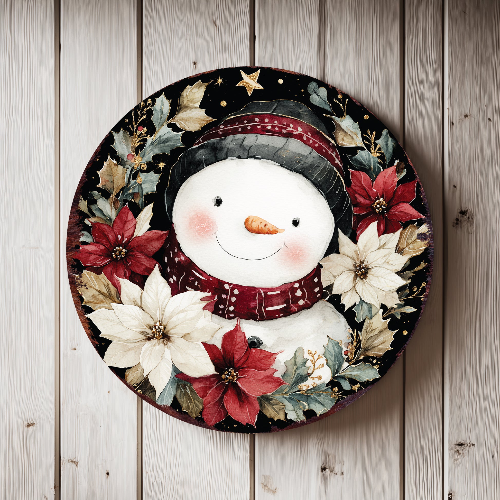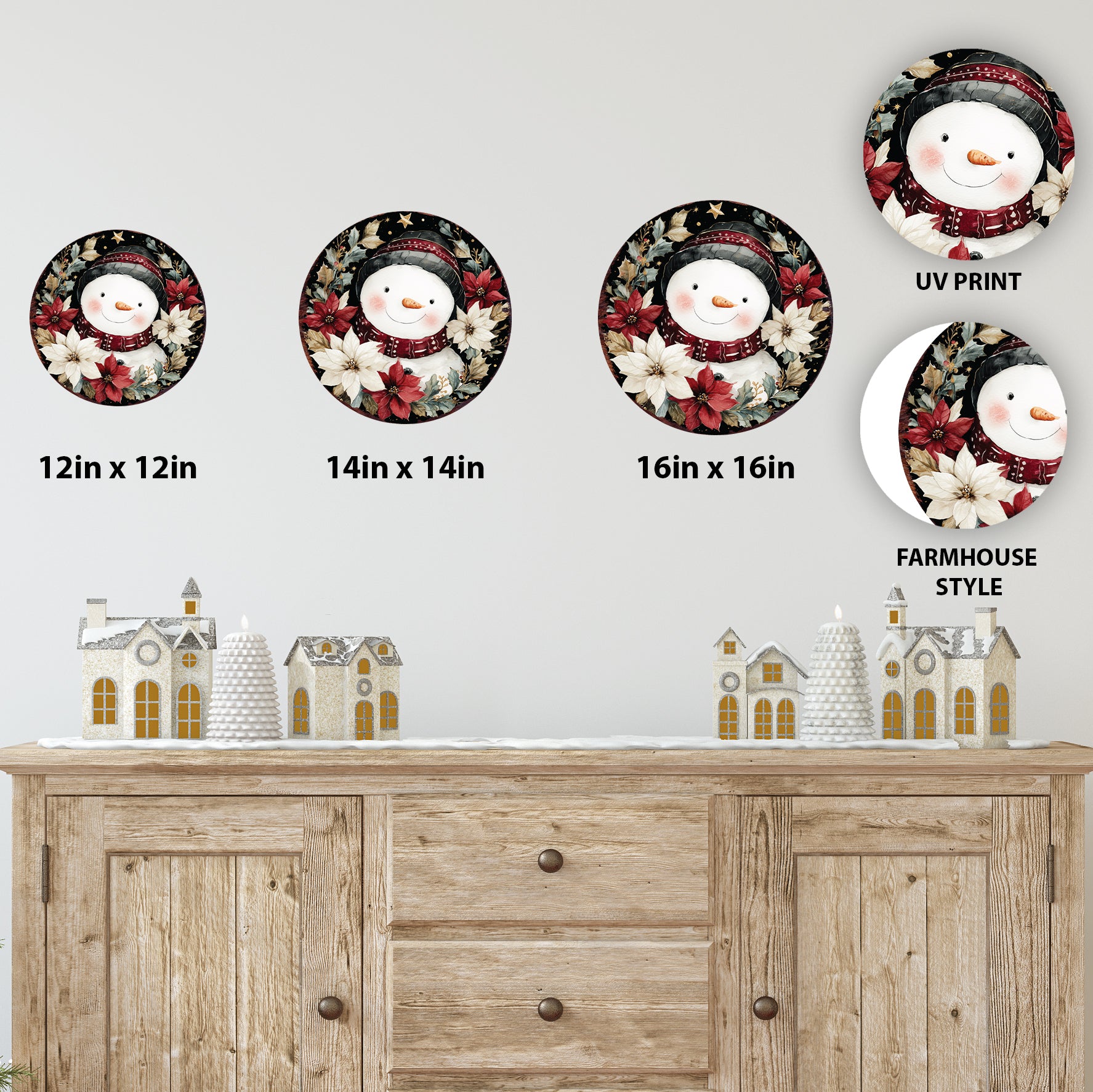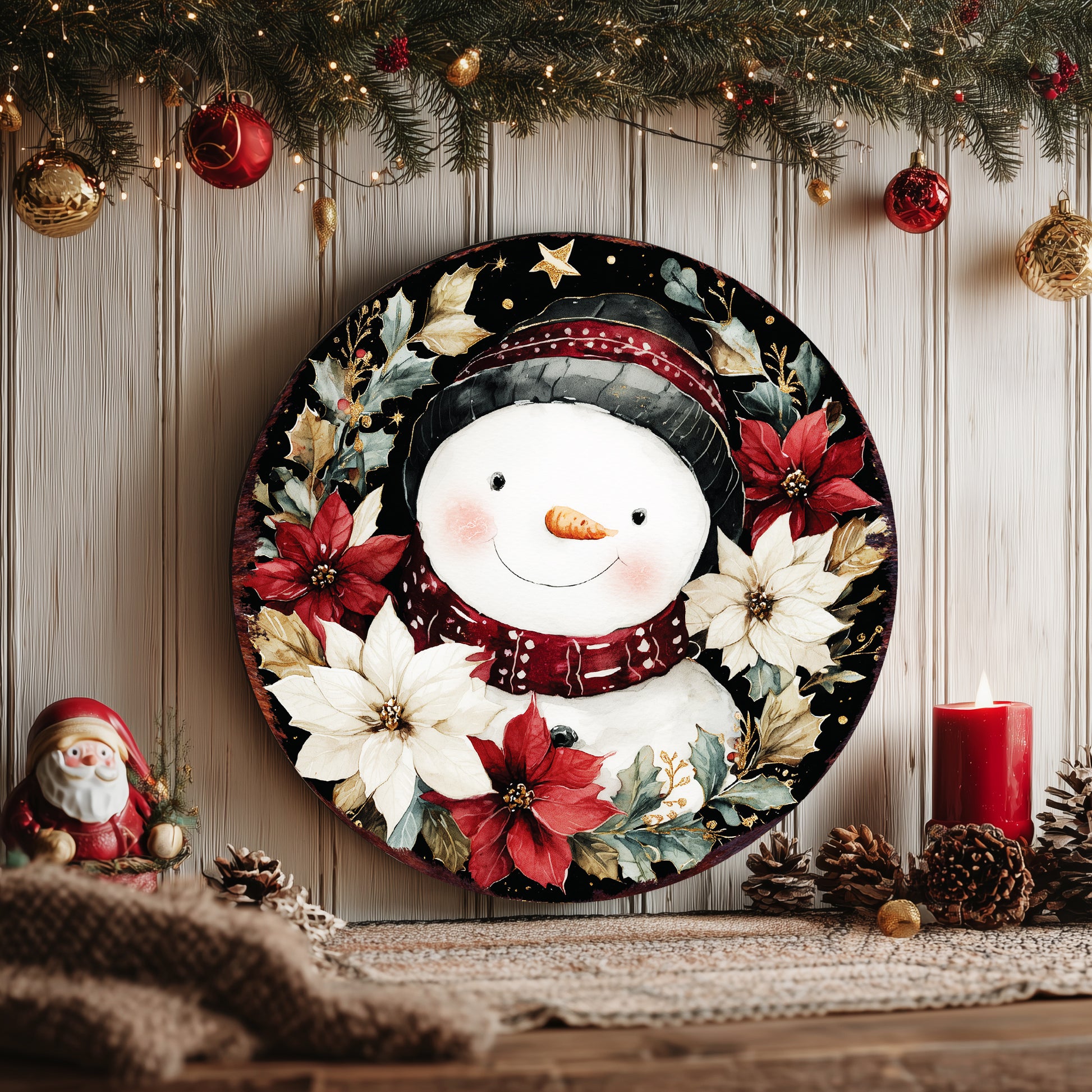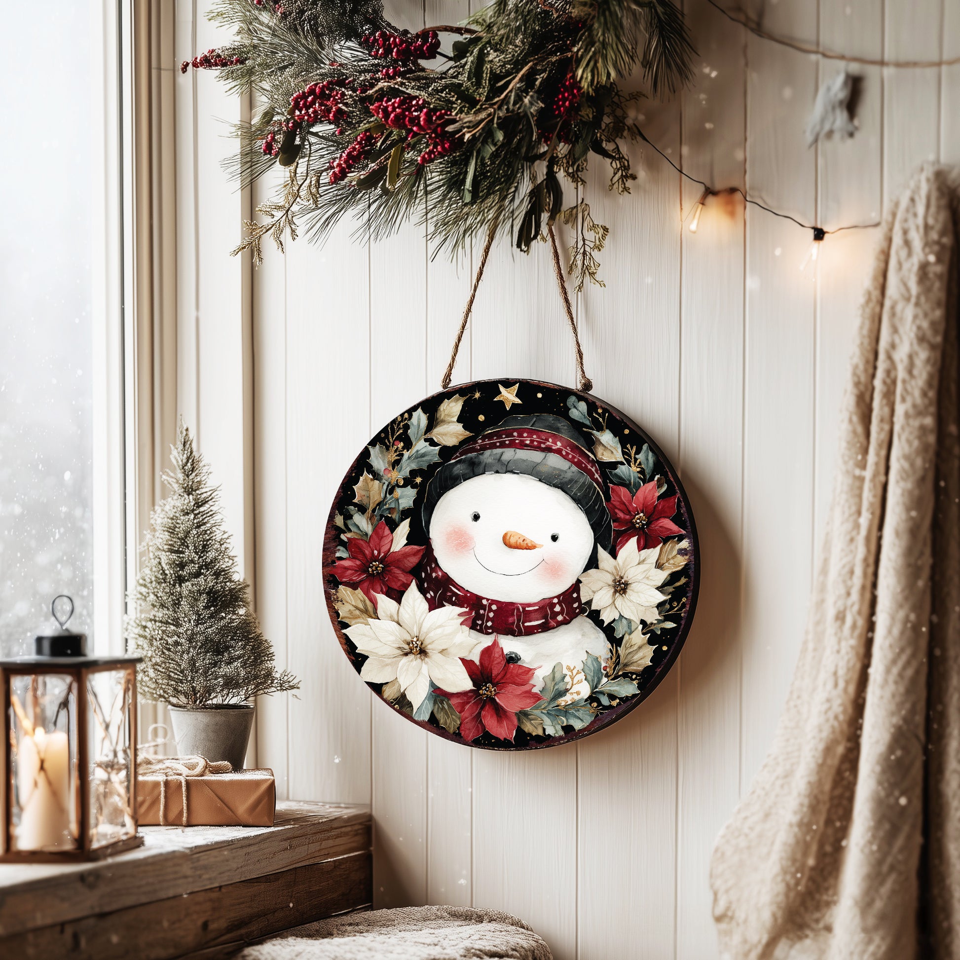 Snowman Christmas Wall Sign – Round Wood Winter Decor with Poinsettias