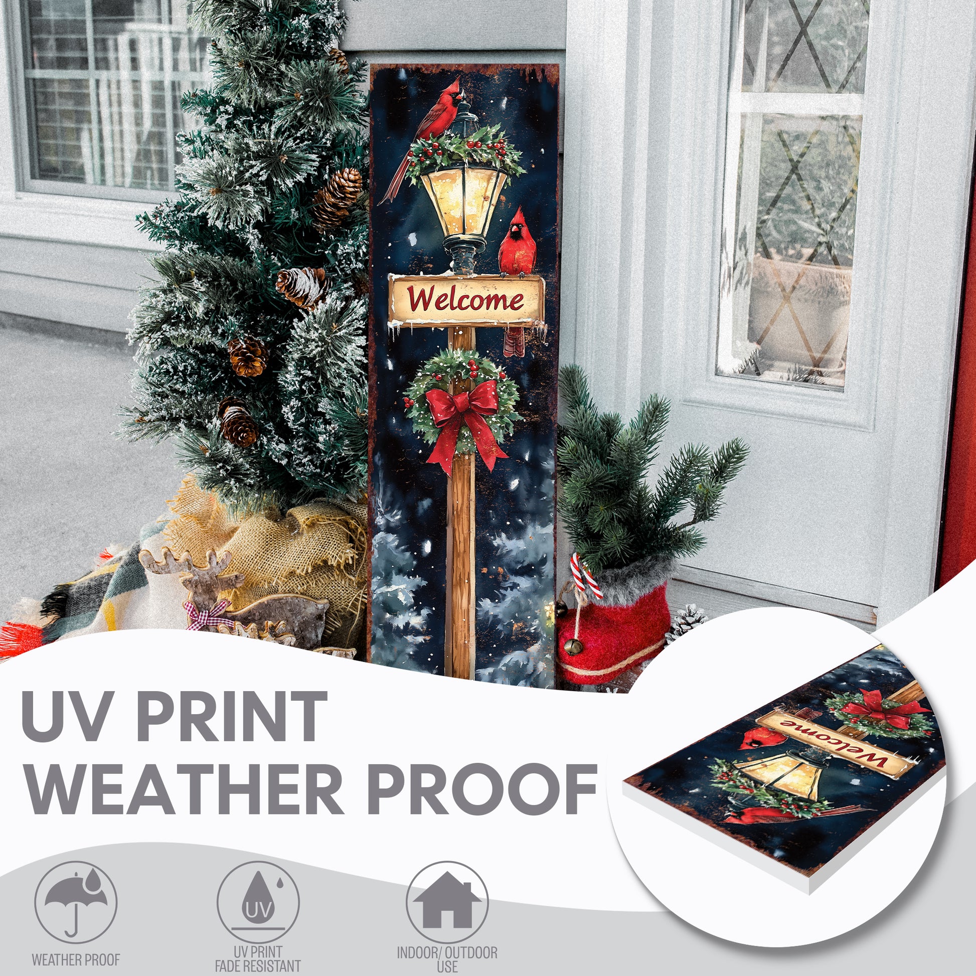 Welcome guests with the warmth of the season using this Christmas Welcome Porch Sign. Designed with rustic charm, it showcases a glowing lantern, red cardinals, festive wreath, and snowy details, making it the perfect addition to your holiday décor. Built with weatherproof and UV-protected materials, this sign is durable for outdoor use yet stylish enough for indoor holiday displays. Available in a variety of sizes, it fits seamlessly into any space—whether on your front porch, patio, garden, or entryway. A festive way to spread holiday cheer all season long!