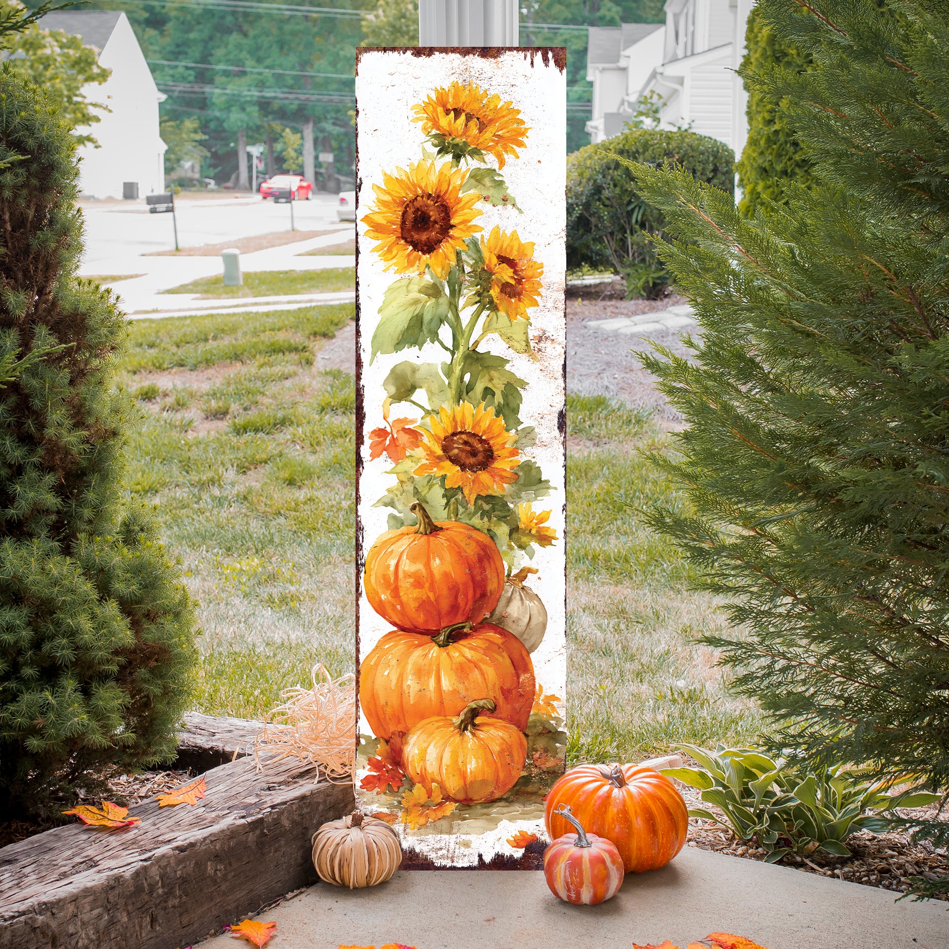 Welcome autumn with our Pumpkin & Sunflower Porch Sign, showcasing stacked pumpkins and bright sunflowers in a charming rustic watercolor design. This vertical wall art adds cozy farmhouse appeal to your front door, garden, or patio. Crafted with UV print technology, it offers vivid, fade-resistant colors perfect for indoor or outdoor display. Available in multiple sizes, it’s an ideal choice for fall decorations, Thanksgiving celebrations, seasonal photo backdrops, or thoughtful housewarming gifts for those who love autumn’s warmth.