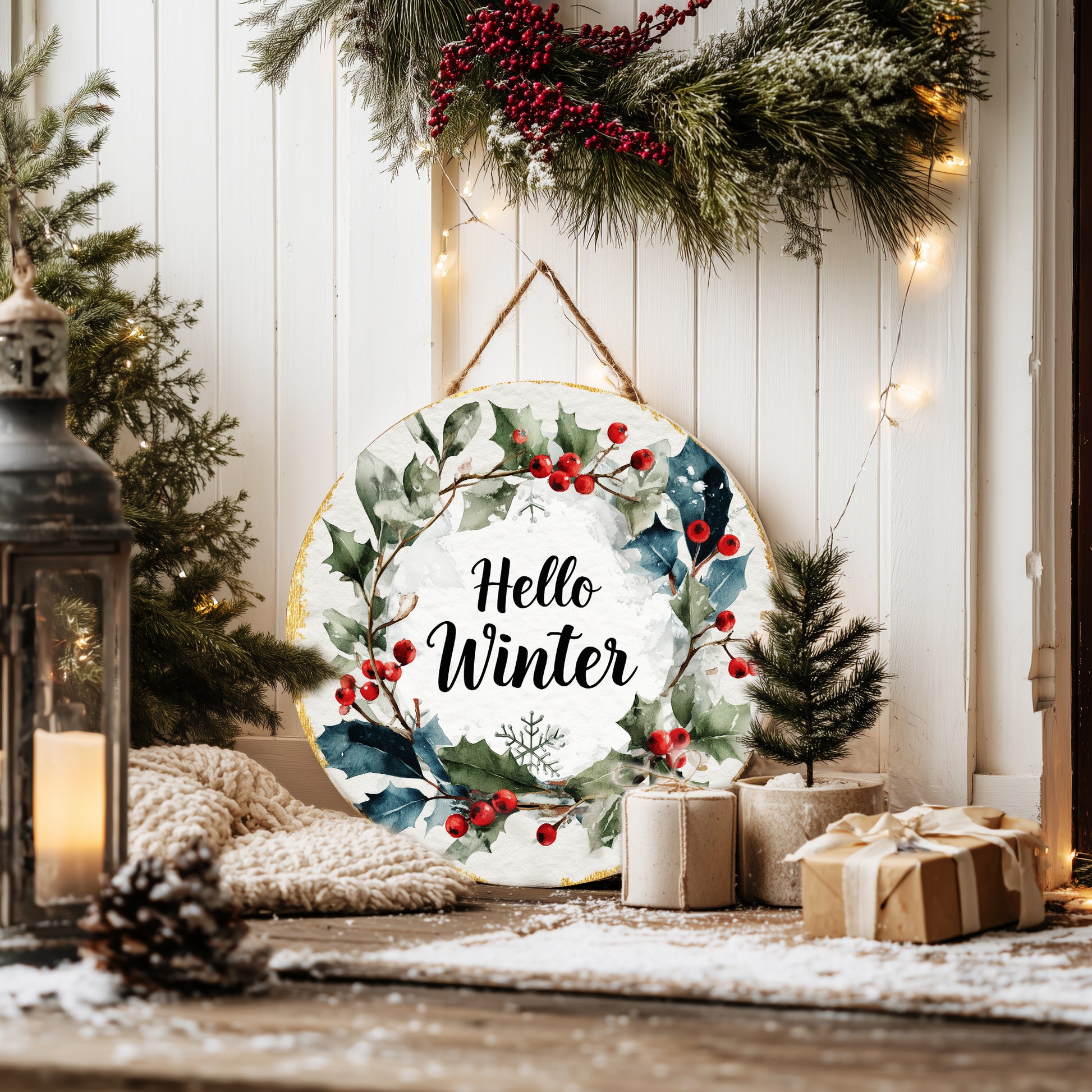 Hello Winter Farmhouse Round Wall Sign | Rustic Seasonal Decor