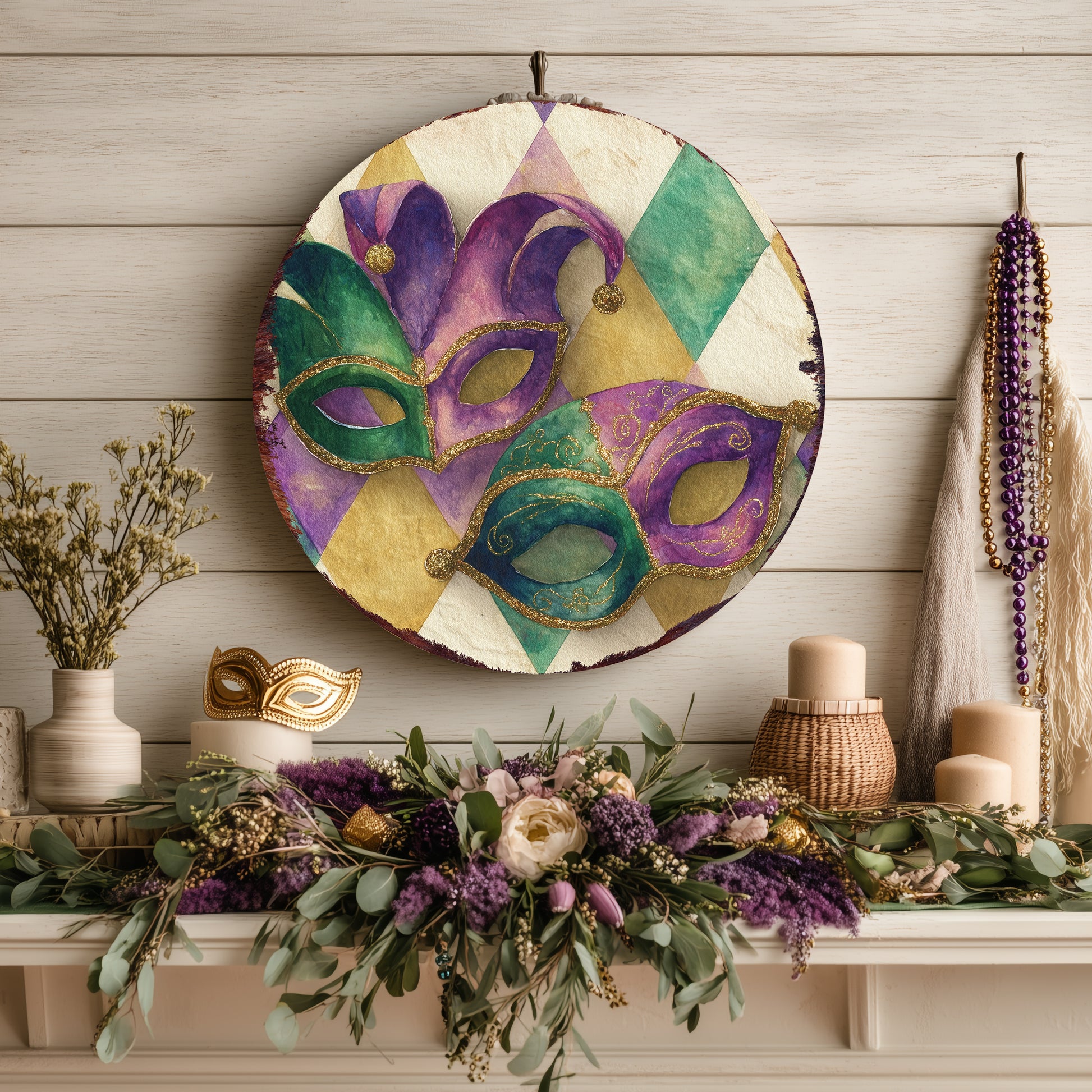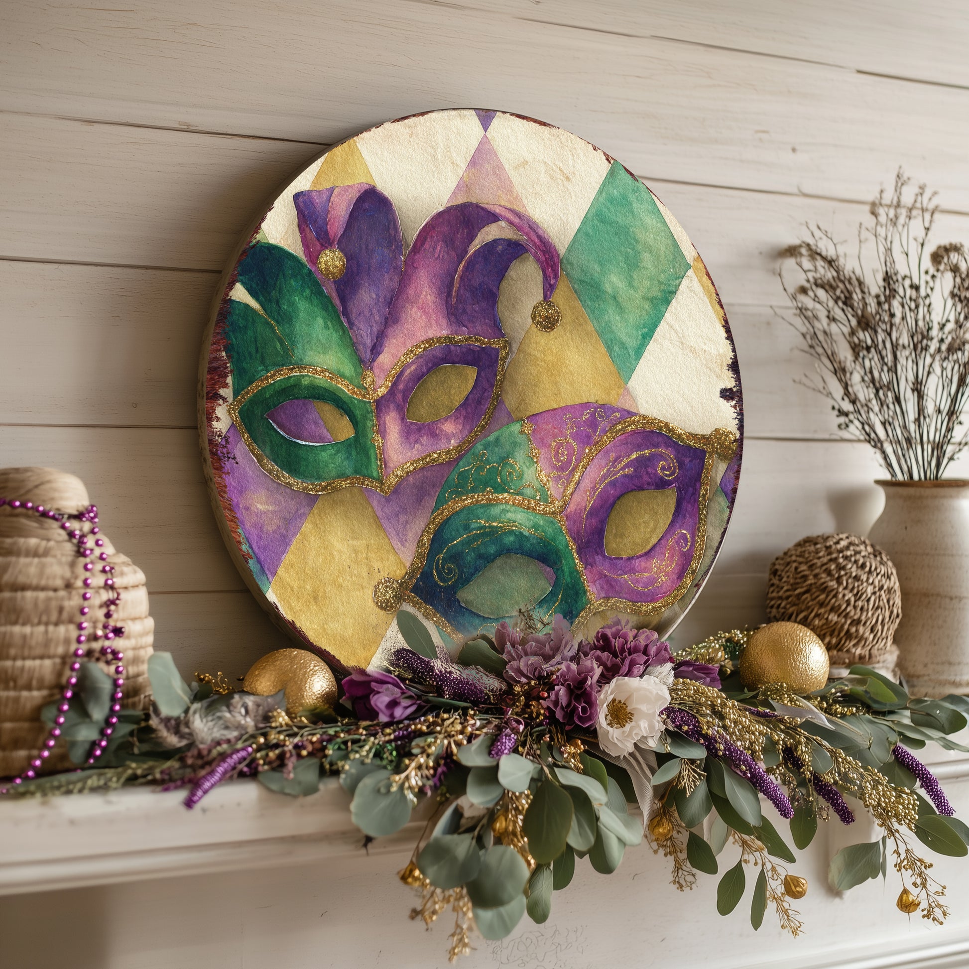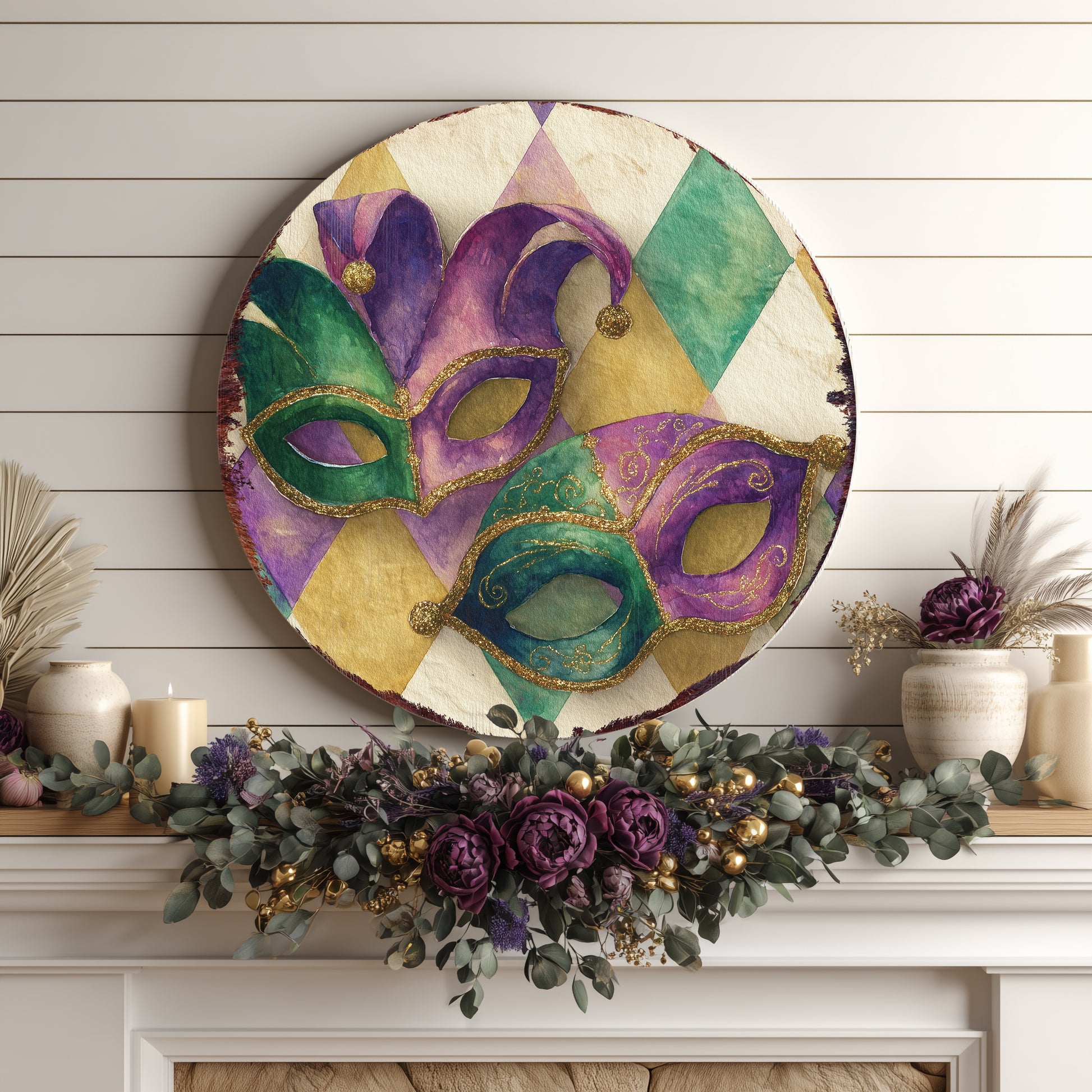 Festive Mardi Gras Wall Sign - Whimsical Jester Mask Fleur de Lis Art for Covered Porch & Entryway Decor