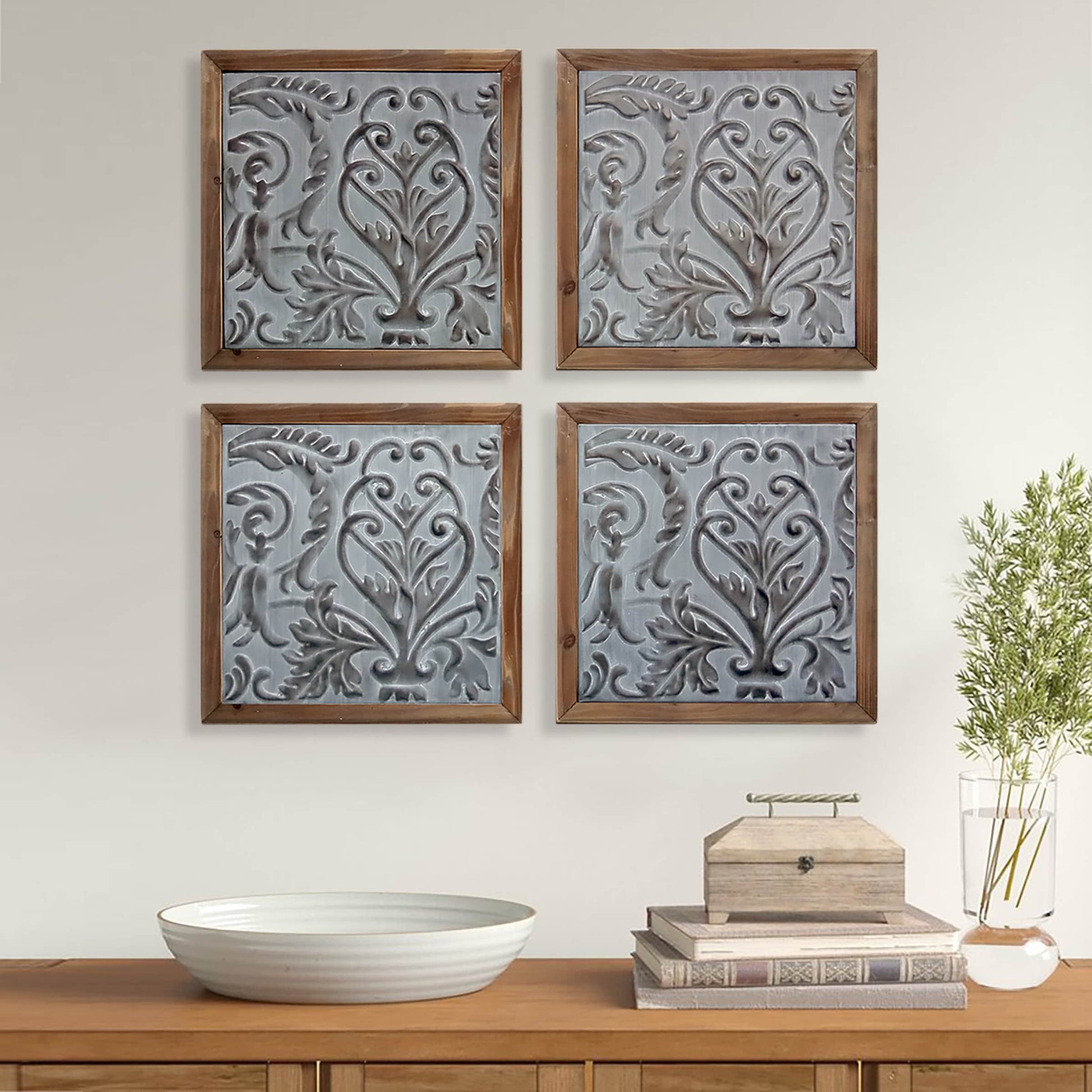 Elegant Framed Wood Plaques Set of 4 | Pressed Tin Wall Art in Warm Brown Tone | Home & Office Decor