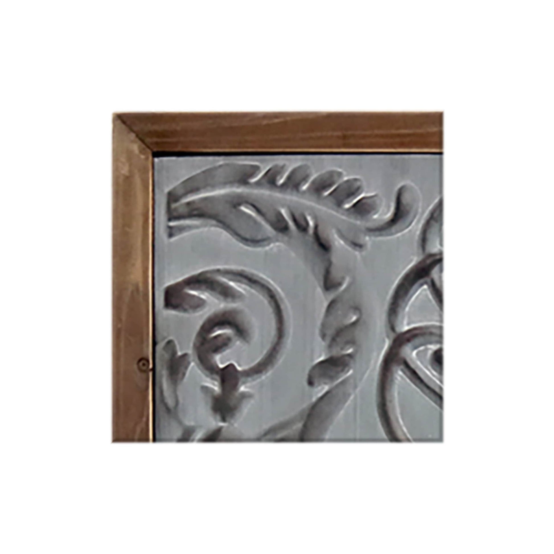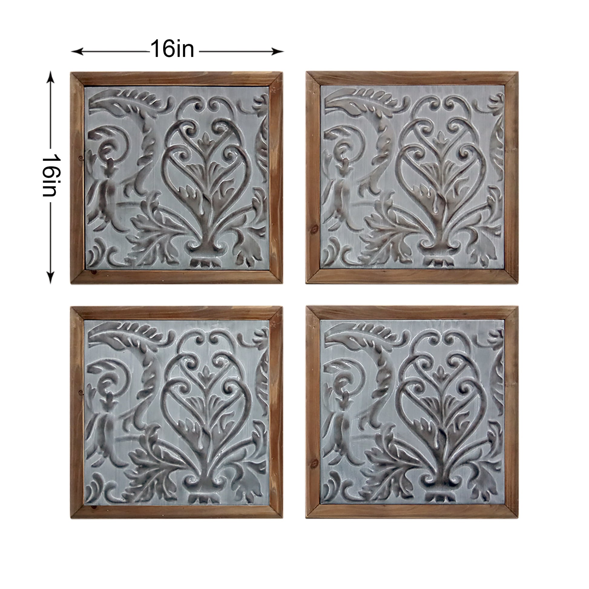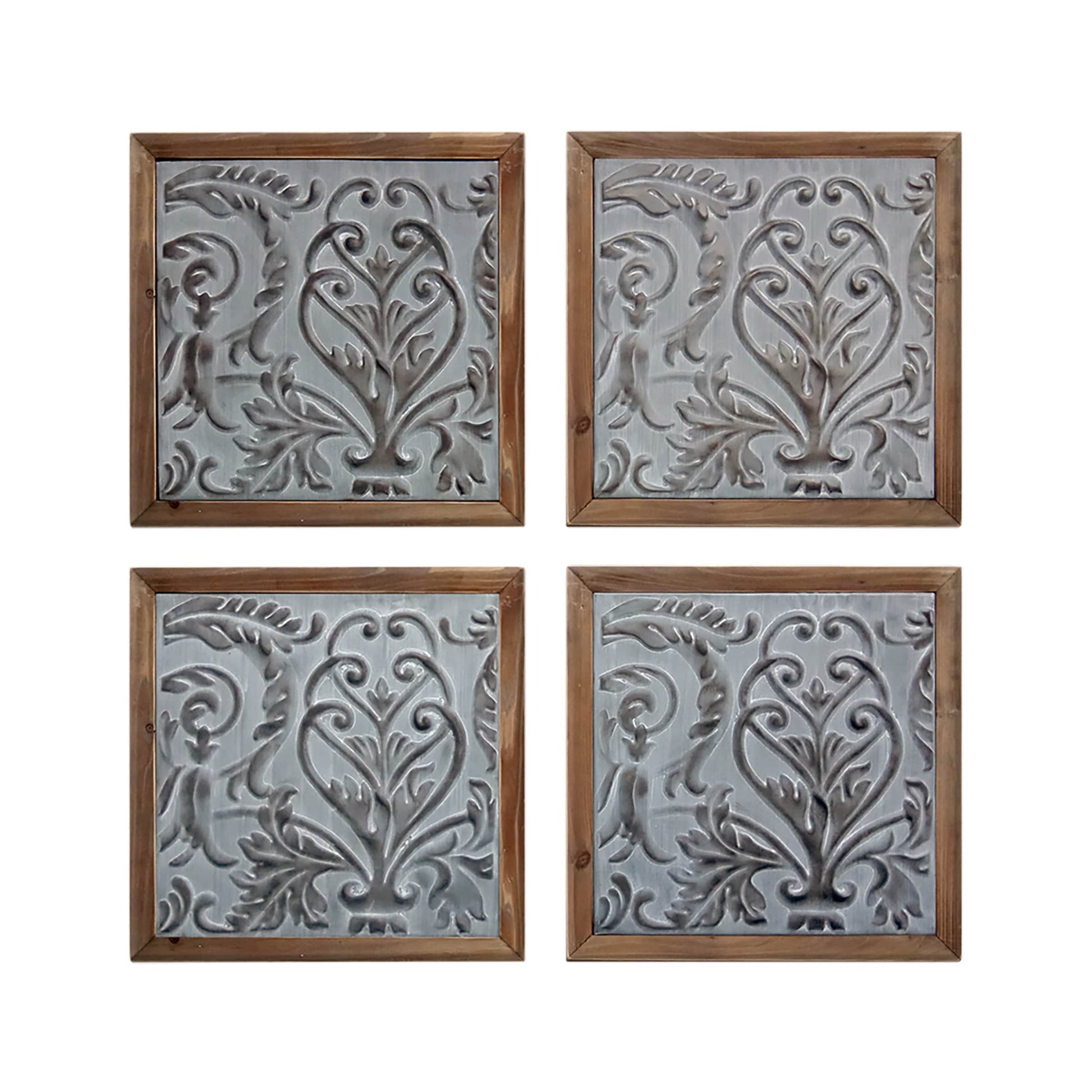 Enhance the beauty of your living space with this exquisite Maxwell Wood Plaques Set of Crafted with pressed tin wall art framed in warm brown engineered wood, each plaque showcases a classic scroll and leaf design in shades of gray, adding a touch of sophistication to any room. Measuring 16x1x16, these plaques are equipped with wall mounting hardware for easy installation above a bed, sofa, or dining table. The timeless look of these plaques suits both traditional and contemporary decor styles, making them a versatile choice for any home or office setting. Not only are these plaques visually appealing, but they are also built to last, ensuring durability and longevity. Elevate your decor effortlessly with the Maxwell Wood Plaques Set of 4, a perfect blend of elegance and charm that will elevate the ambiance of your space for years to come.