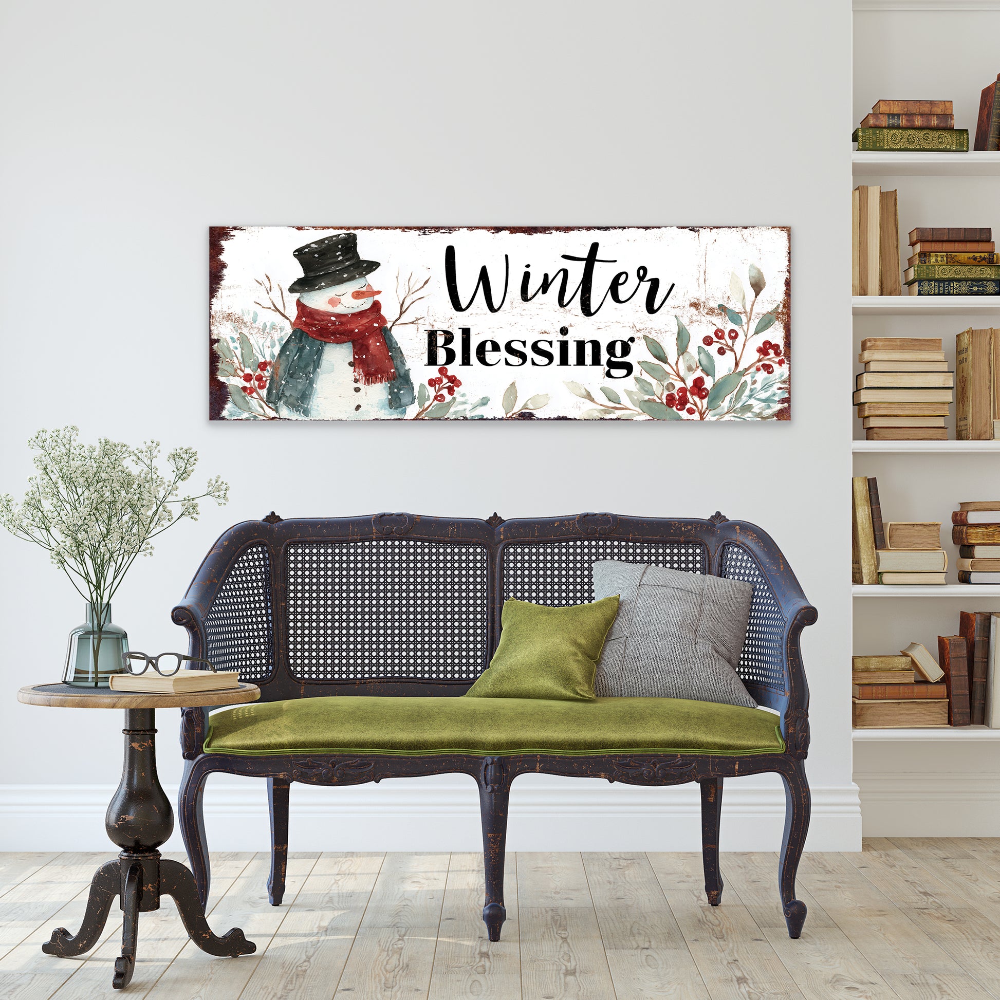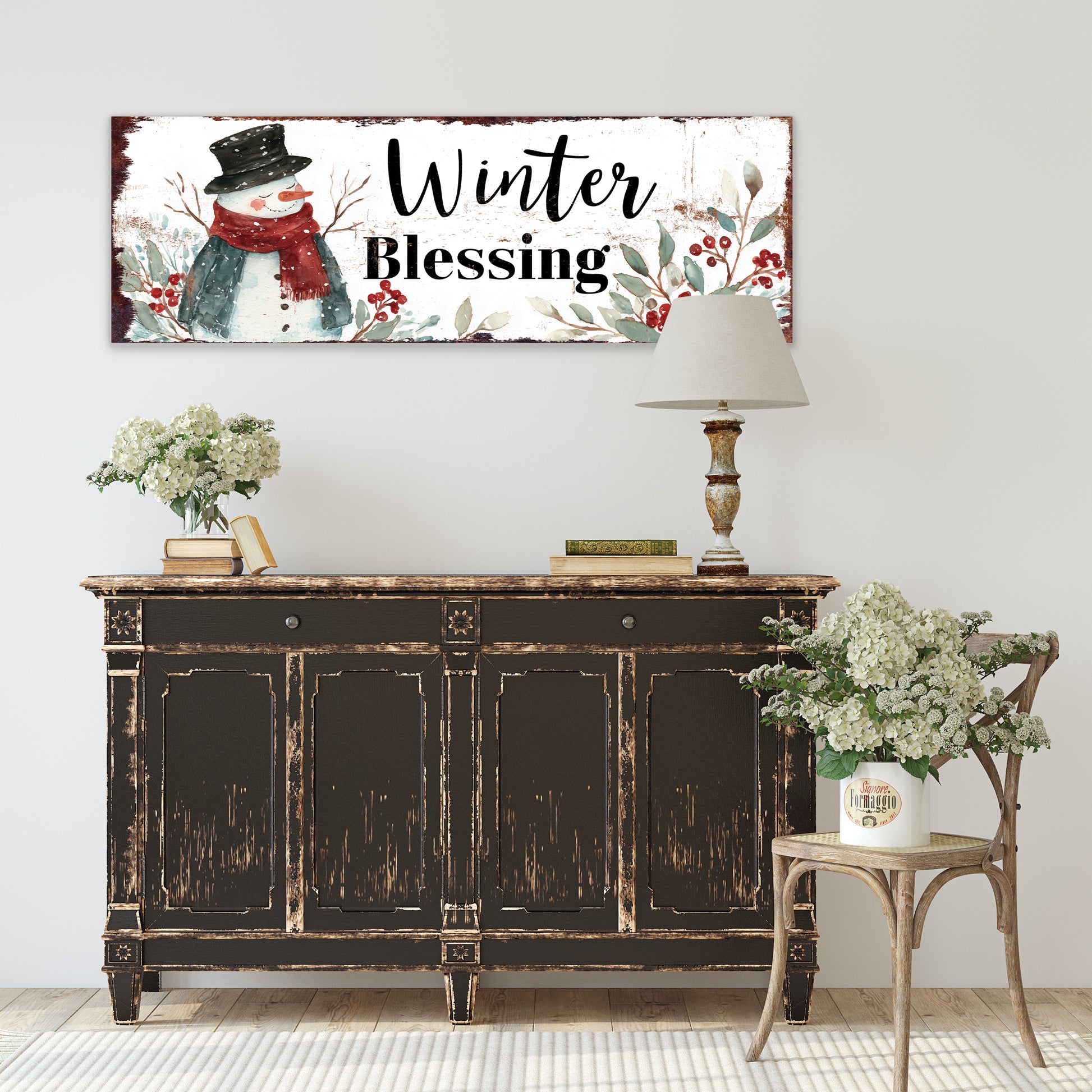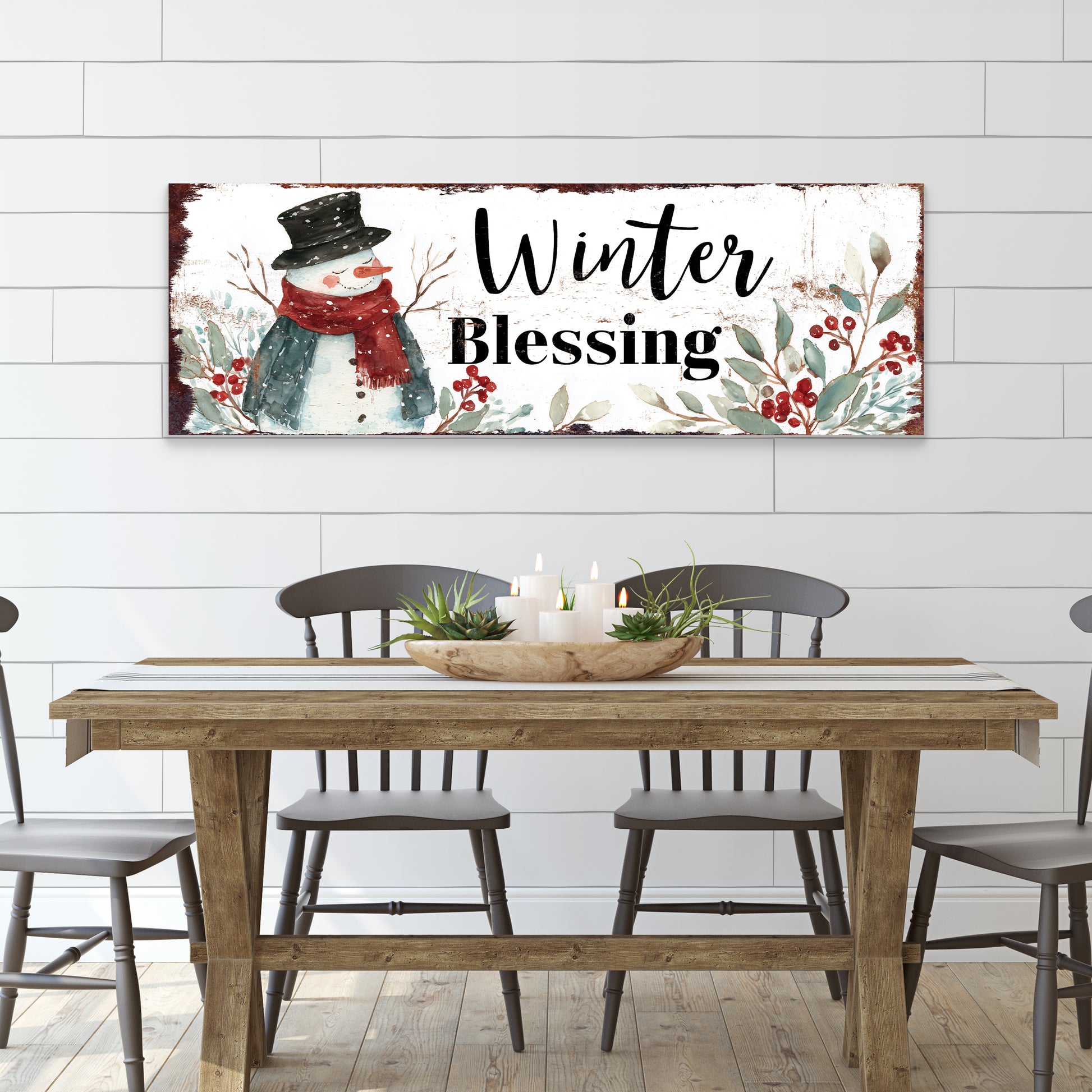 Set against a distressed white wood-look background, this wall sign radiates cozy countryside vibes. The message “Winter Blessing” is thoughtfully printed in bold, friendly typography that complements any seasonal decor style—from vintage to modern farmhouse.