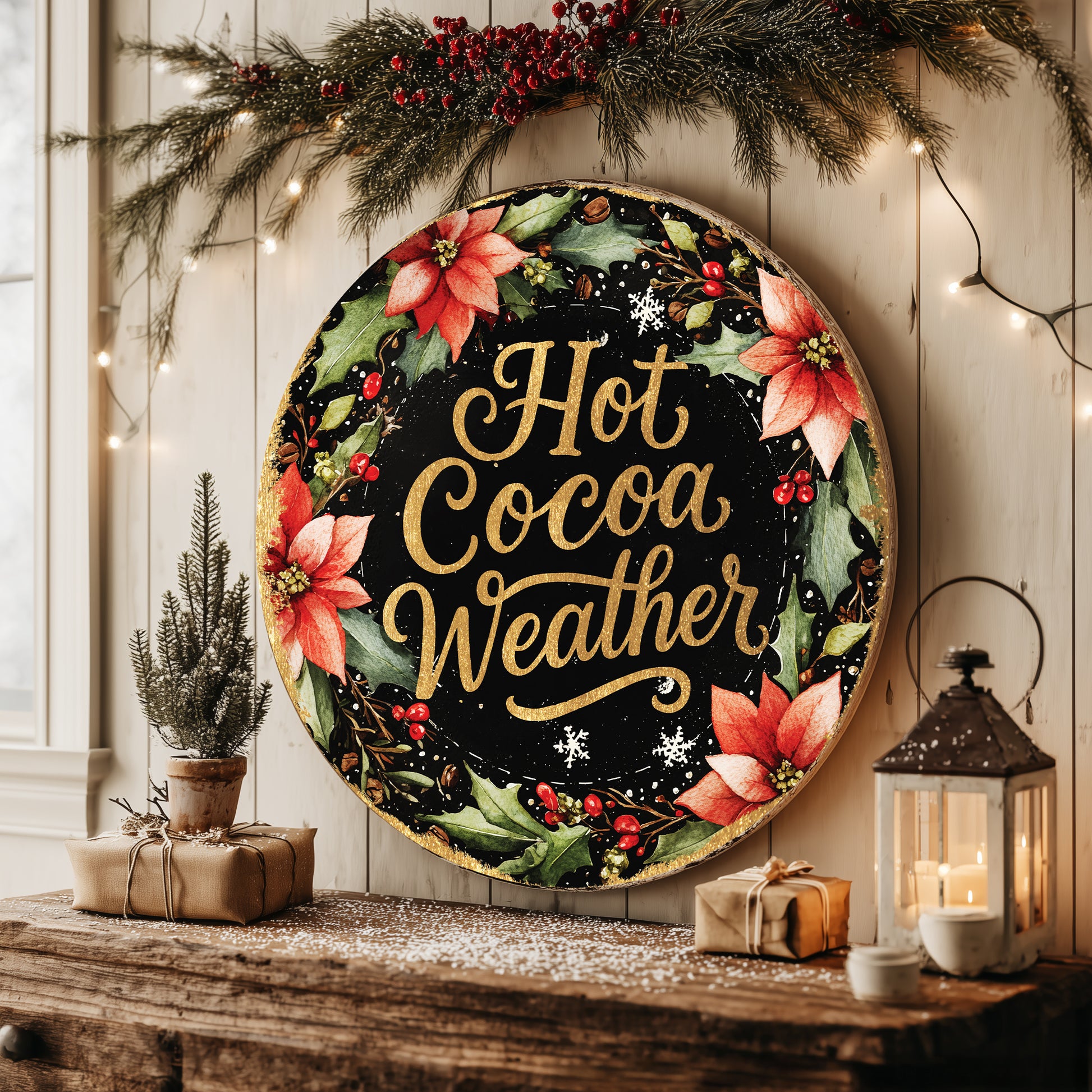 Transform your home into a snug winter retreat. Our charming "Hot Cocoa Weather" round sign instantly creates an inviting, festive atmosphere, perfect for greeting guests or warming up your kitchen. Celebrate the season with heartwarming farmhouse style that lingers long after the holidays.